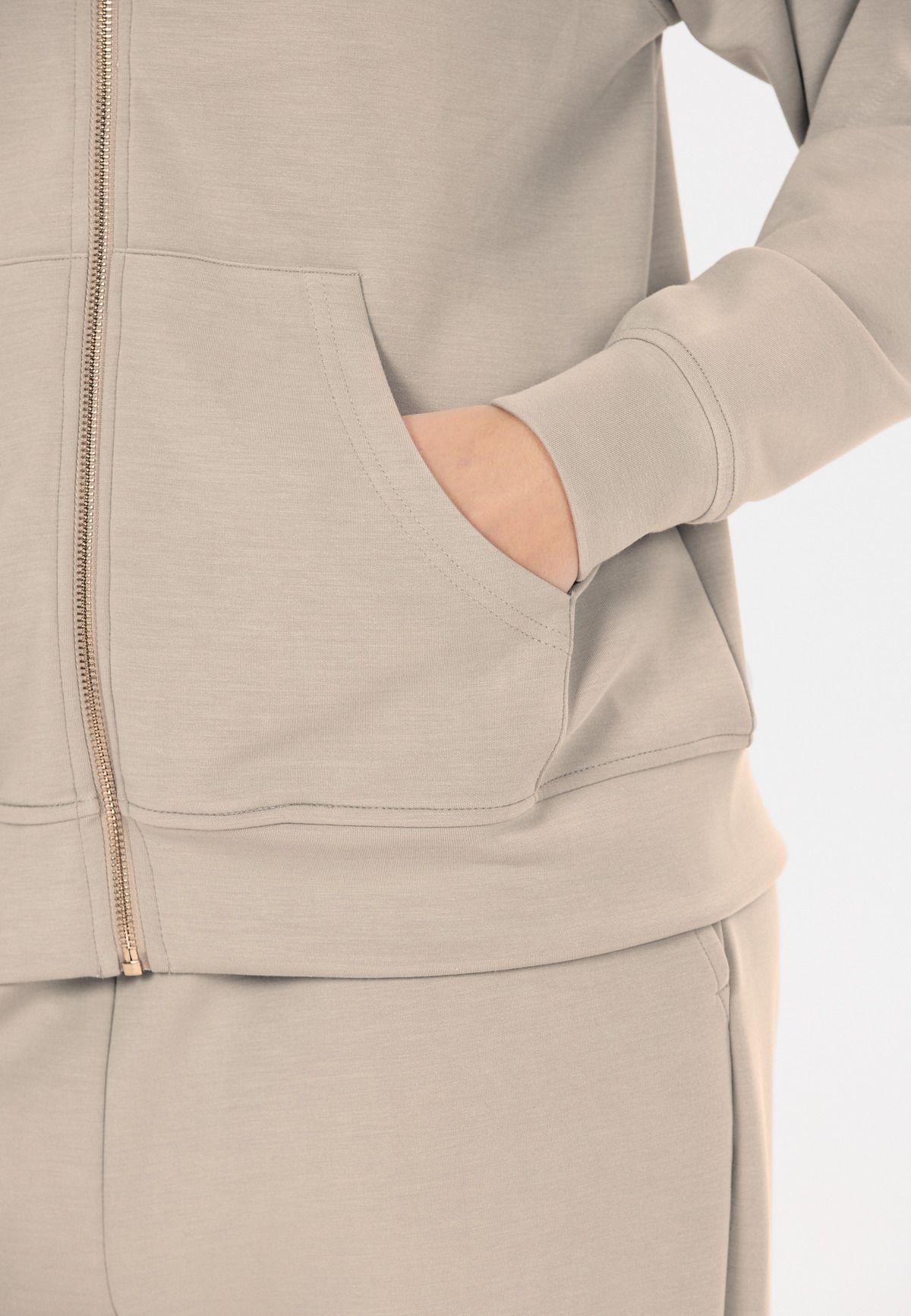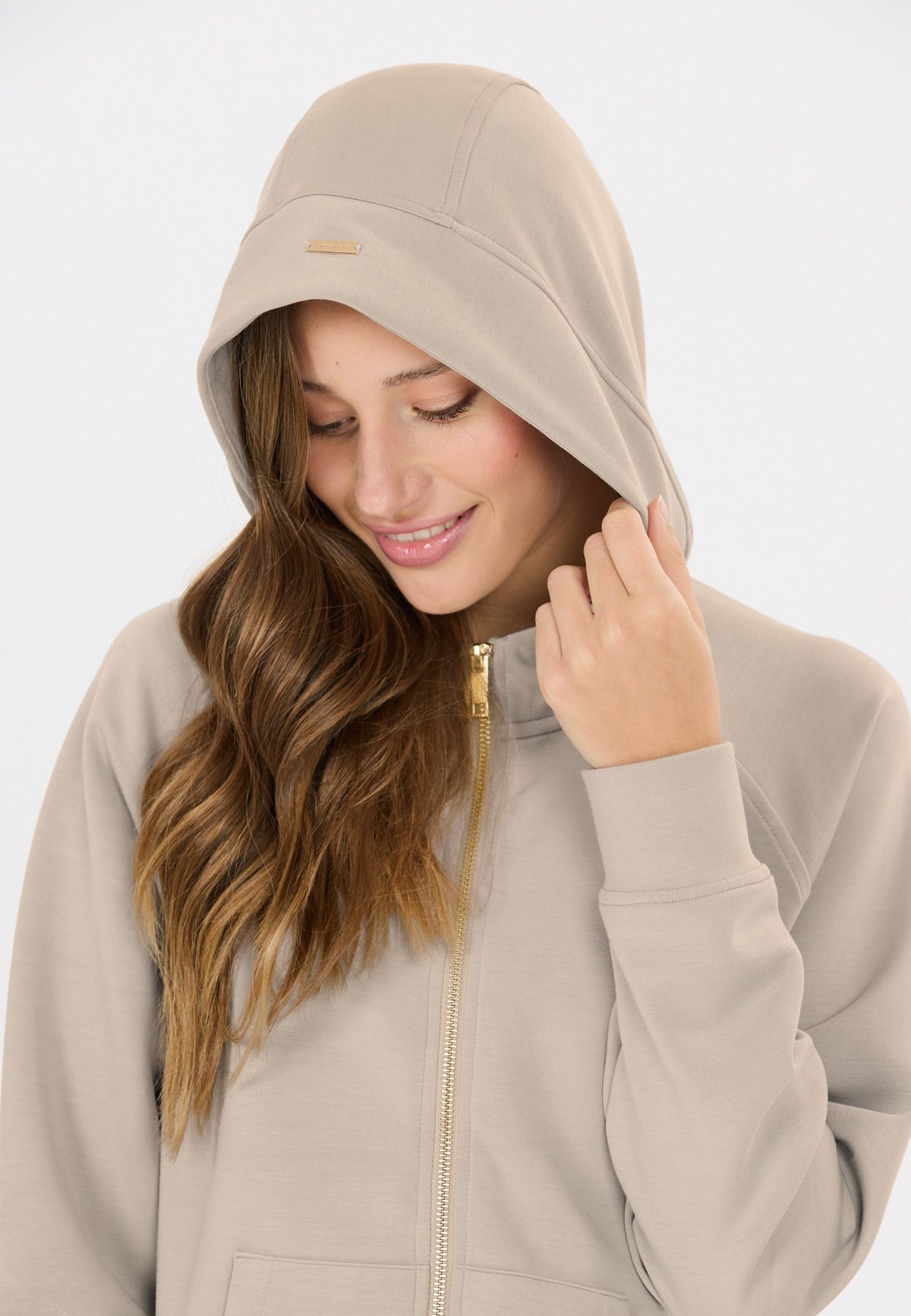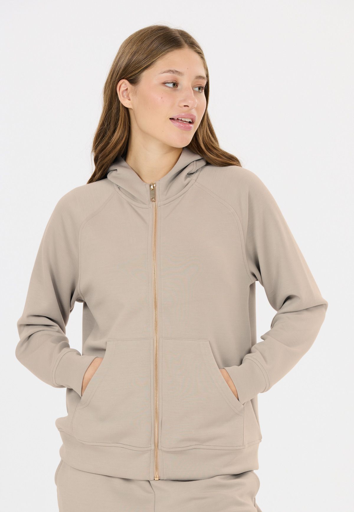 Hættetrøjen "Jacey" er det perfekte valg til sportslige kvinder, der værdsætter kvalitet og funktionalitet. Med en materialeblanding af 51 % polyester, 44 % modal og 5 % elastan tilbyder denne jakke optimal bærekomfort, åndbarhed og bevægelsesfrihed. Med en blød hætte, gennemgående lynlås og smarte lommer indbyder jakken til afslappede og sporty timer.