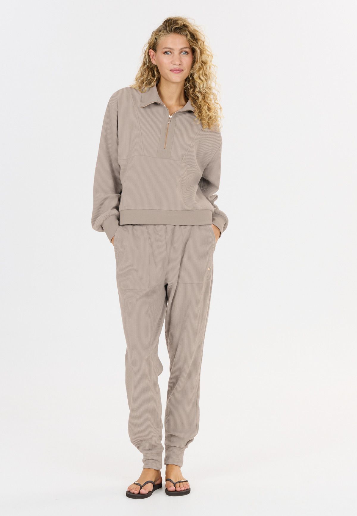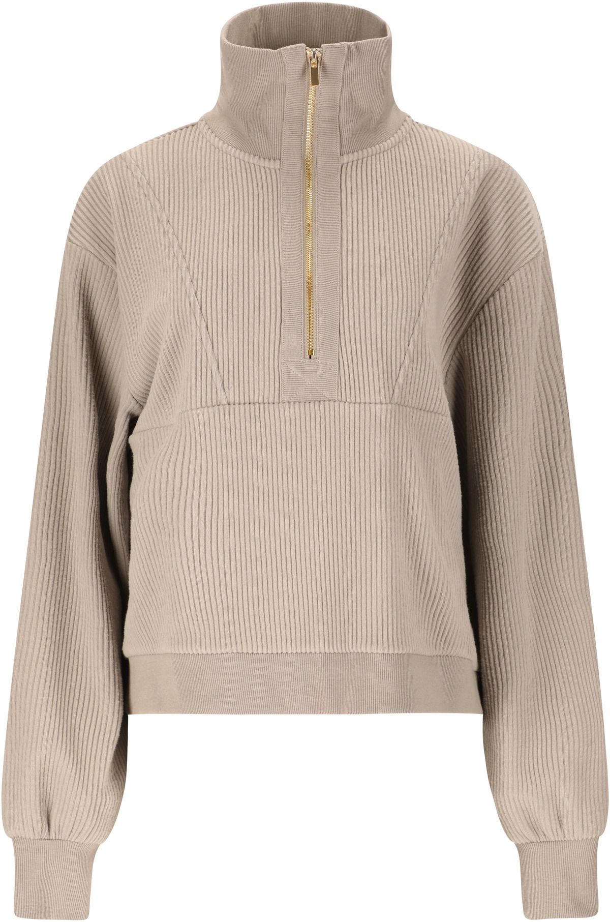Reiley Half Zip-sweatshirt til kvinder kombinerer blød komfort med elegante detaljer: Blandingen af bomuld og polyester er behagelig blød mod huden, mens den høje ribkrave, ribkantede afslutninger og den halvlange lynlås med guldfarvede detaljer giver looket et stilfuldt touch. Den bløde ribstruktur sikrer en høj kvalitet, og det diskrete logo-badge afrunder designet elegant – perfekt som et statement, når det bæres alene, eller sammen med de matchende Reiley Sweatpants.